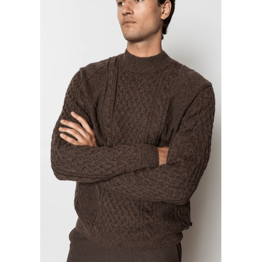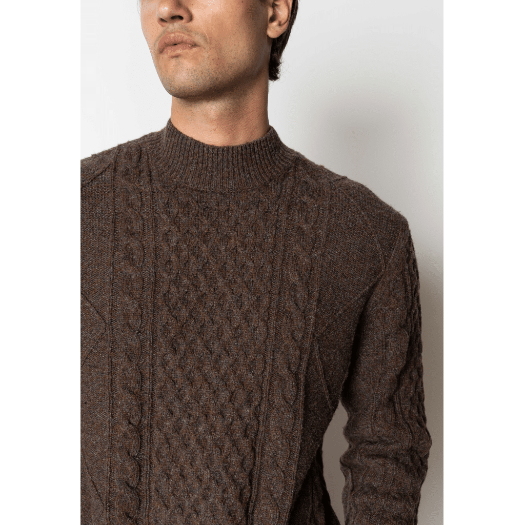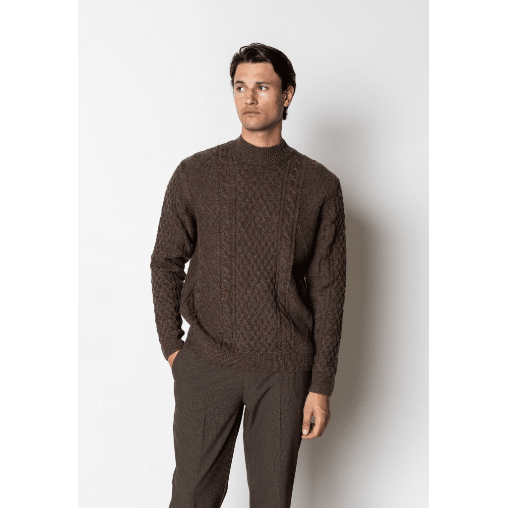 Morgan is a wool blend knitted turtle neck jumper with ‘fisherman’ pattern. The fit is regular.